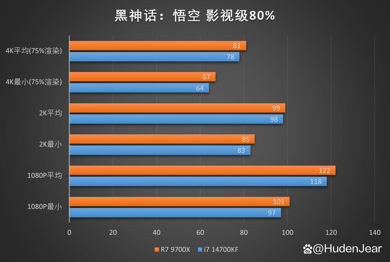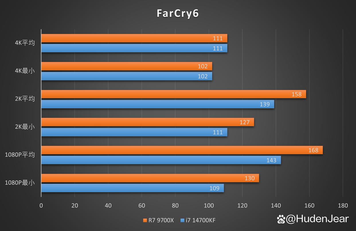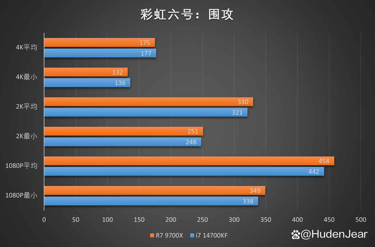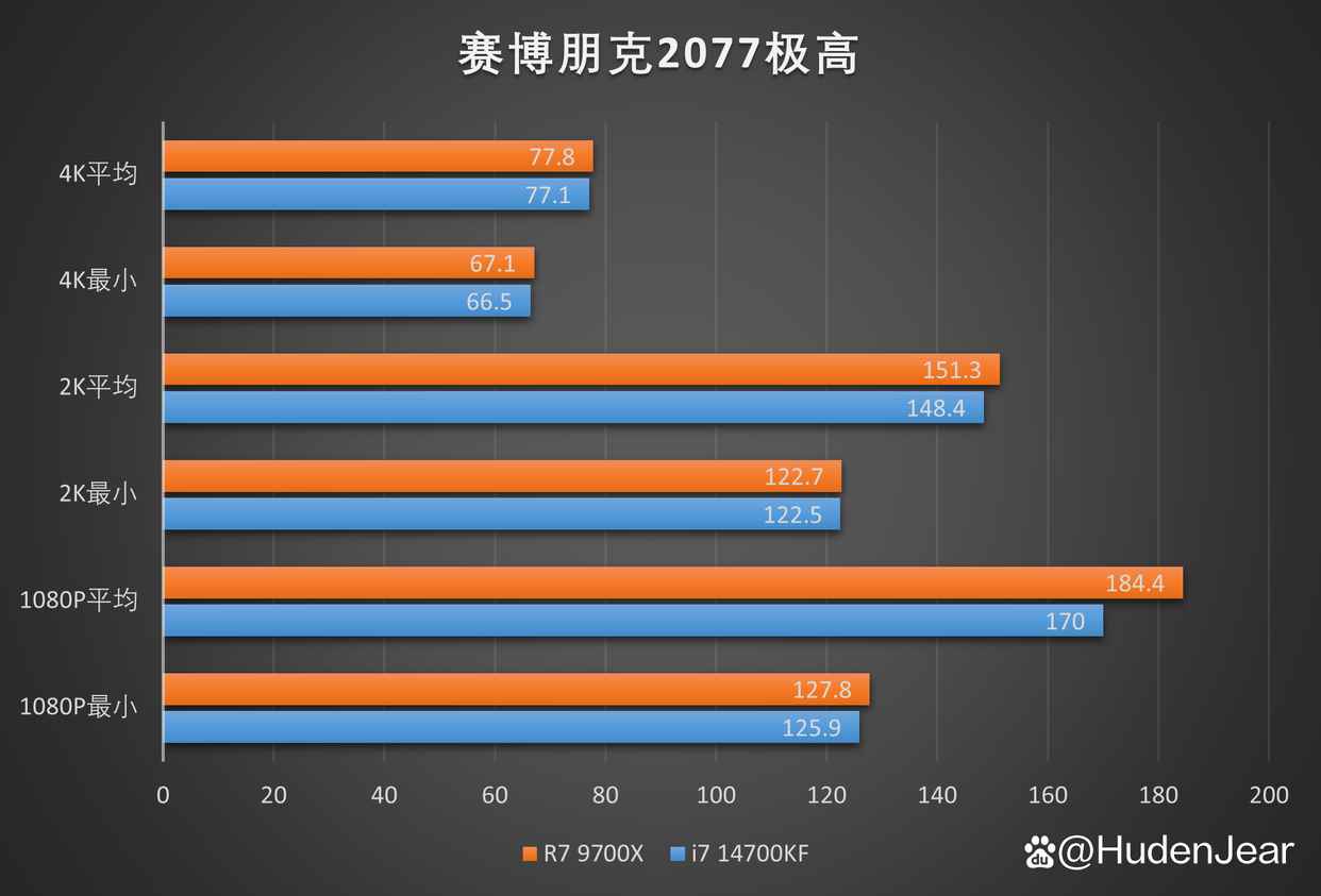 游戏测试里面基本都是一个趋势,那就是4K下R7 9700X和14700KF相比,R7大概率小胜一点,随着分辨率到2K和1080P,i7 14700KF基本没有赢面,沦为被R7 9700X爆杀的对象。这还只是9700X这样的桌面级,要是98X3D来了得飞起来
