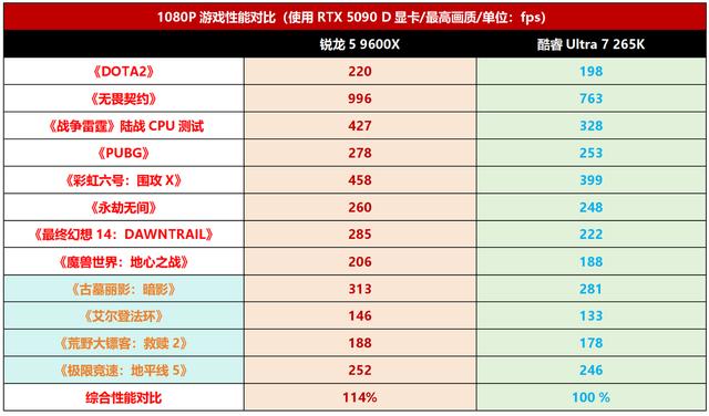当然,不是每个买主流U的玩家都会使用RTX 5090 D这样的旗舰显卡,主流游戏装机大家更倾向于A+A、I+N 的中端组合,所以我们这里也选用锐龙5 9600X + RX 9060 XT 8GB与酷睿Ultra 7 265K + RTX 5060的组合进行了对比,看看玩家关注的实际配置下,两者有何差异。从实测结果来看,也是锐龙5 9600X + RX 9060 XT更有优势,综合所有游戏的成绩来看,平均领先酷睿Ultra 7 265K + RTX 5060的幅度达到了12%,也差不多领先了一个档次。