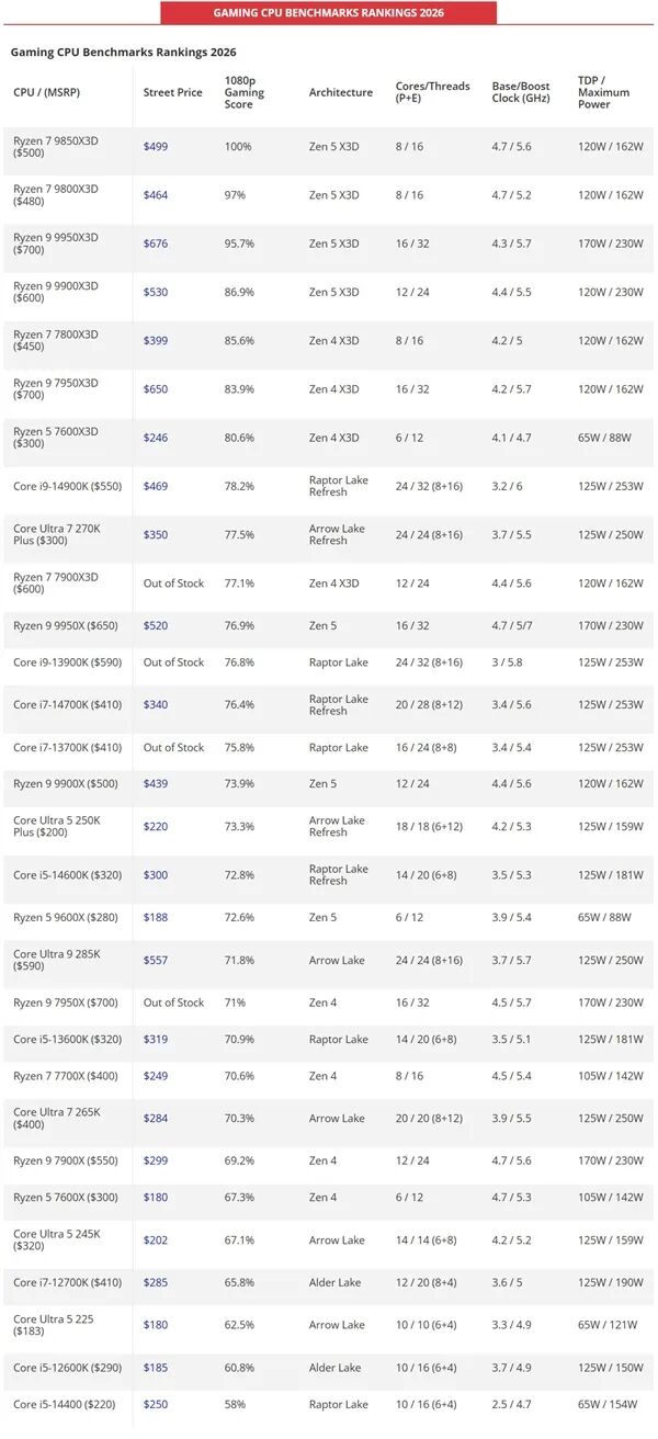 酷睿Ultra7 270K Plus成了这次榜单里最亮眼的全能选手,锐龙79850X3D则牢牢焊死了游戏神U的位置。这份完整的天梯榜,也给普通用户装机选CPU,提供了最靠谱的参考依据。