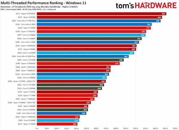 多线程性能这块,AMD又拿回了榜首。锐龙99950 X3D拿下多线程榜第一,锐龙99950X排在第二。酷睿Ultra7 270K Plus位列第三,更关键的是,它的售价只有前两款AMD旗舰的一半,成了高端生产力CPU里的性价比黑马。