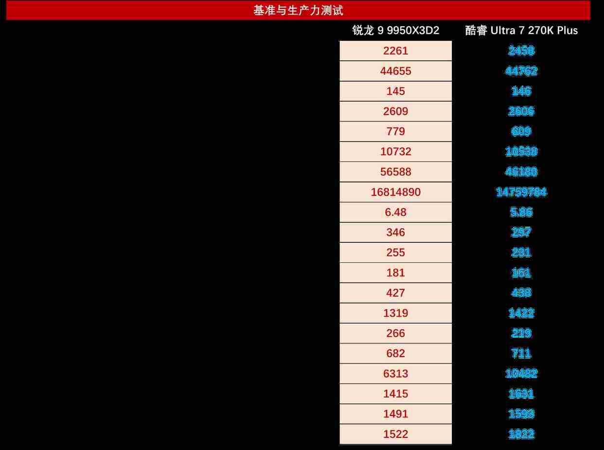 综合来看,拥有64MB×2第二代3D V-Cache缓存的锐龙9 9950X3D2 Dual Edition在渲染、仿真、科学计算与数据分析类应用中优势特别明显,对没有X3D缓存的常规版处理器属于“降维打击”,而相对拥有64MB第二代3D V-Cache缓存的锐龙9 9950X3D也有可观的提升。对比目前Intel最强的竞品处理器酷睿Ultra 7 270K Plus,锐龙9 9950X3D2 Dual Edition也有10%以上的领先优势,是当之无愧的生产力的“王者”。