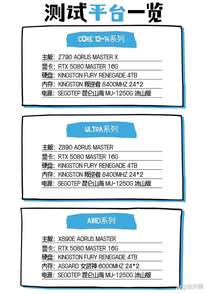 在简单介绍完本次测评的14颗CPU后,接下来看看我们的测试平台,为了仅可能统一标准,主板和显卡以及内存条都尽可能的选择了相同定位的型号。