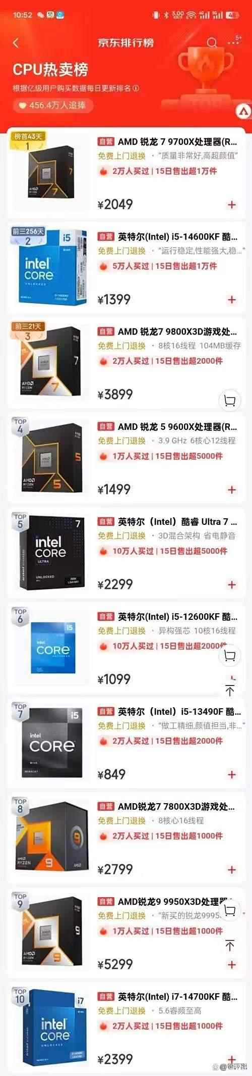 京东这边CPU销量前十中AMD和Intel分别占据了5款,销量最高的是Ryzen7 9700X,英特尔i5-14600KF紧随其后。而亚马逊这边的数据则呈一边倒,和德国硬件零售商Mindfactory的数据几乎一致,AMD的处理器具有强大的市场统治力,完全占据了销量榜的前10,而Intel的Ultra系列处理器在第28位才出现。不过可以看到X3D系列无论在哪都是非常受欢迎的,那它真的有这么值得购买吗?到底能强多少?我们等会测试来见真章。