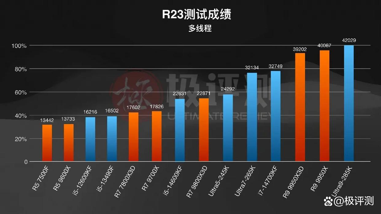 单核性能上,14代的i7-14700KF表现亮眼,真是倒反天罡。而AMD的X3D系列并未发挥出大缓存的优势,分数比较难看。来到多线程跑分上,U9-285K依旧领先,24核心24线程不是盖的,在处理视频编辑、3D 渲染这些多线程任务速度肯定相当轻松。