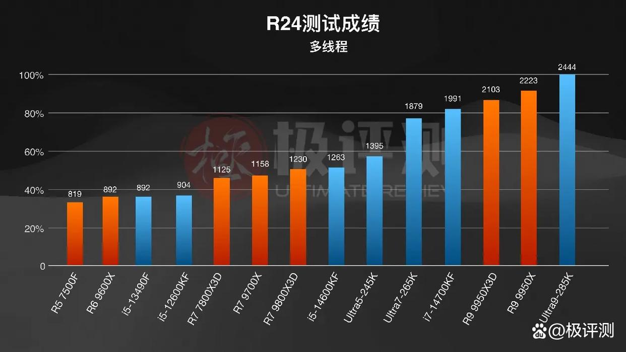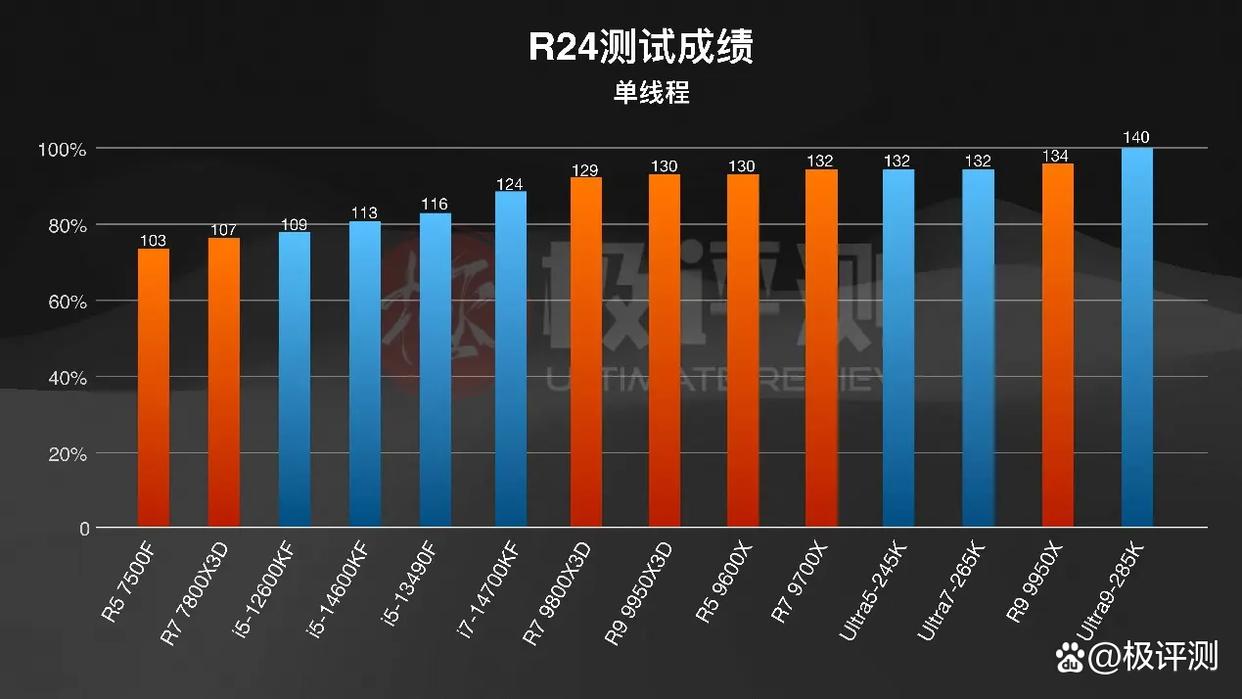 R23与R24的单线程跑分上,285K依旧是带着轻微优势拿下第一,245K在R23中成绩略有些偏低,R24倒是正常不少,总的来说单线程中差距不算特别大。