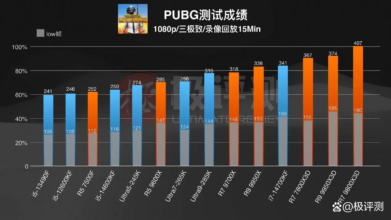 首先来看《PUBG》,我们选择了同一局游戏录像回放来进行测试,可以看到一来游戏场景AMD立马发力,就14700KF为Intel撑了下场面,三颗X3D处理器包揽前三,大缓存优势在网游中太明显了!Intel新架构的三颗Ultra系列全歇菜,怎么说呢,全被1800块的9700X干掉了,蓝队的处理器普遍比同价位的红队处理器低不少。