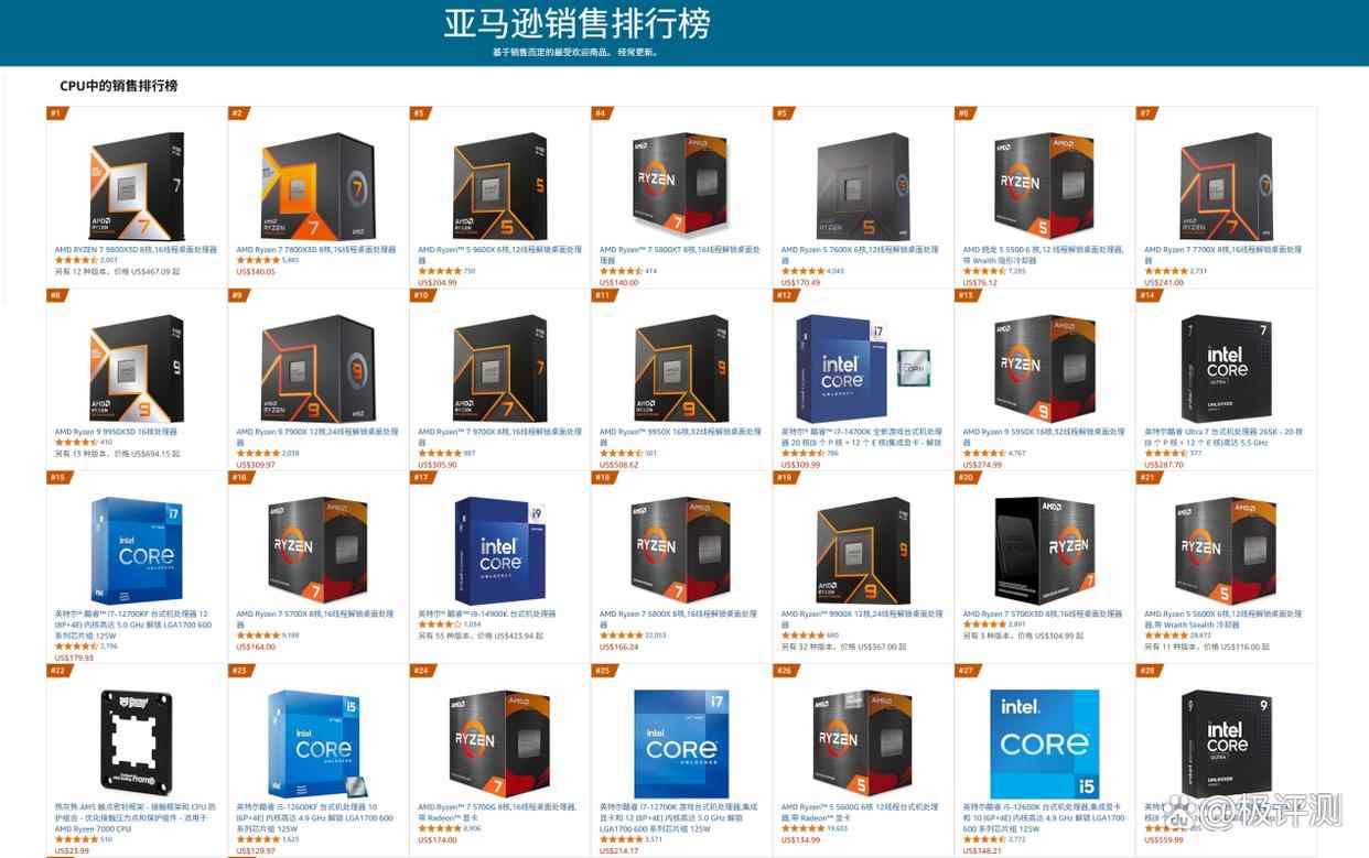 开始之前们先来看两个有趣的小数据,看看目前市场上大众的选择是怎么样的,以下是618期间京东的CPU热卖榜和亚马逊的销售排行榜。