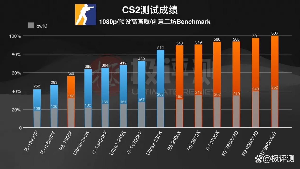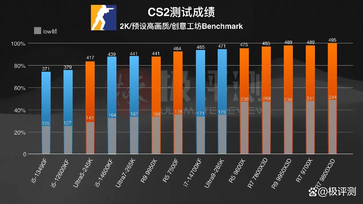 《CS2》使用创意工坊的benchmark地图进行测试,三颗X3D处理器依旧占据前三,甚至前六全部都是来自AMD的处理器,直接占据了半壁江山。其中9700X非常不错,快赶上7800X3D了, 对比同价位的245K帧数提升了足足47%。即使是在百元价位的入门处理器上,7500F也要对比13490F提升也有34%。