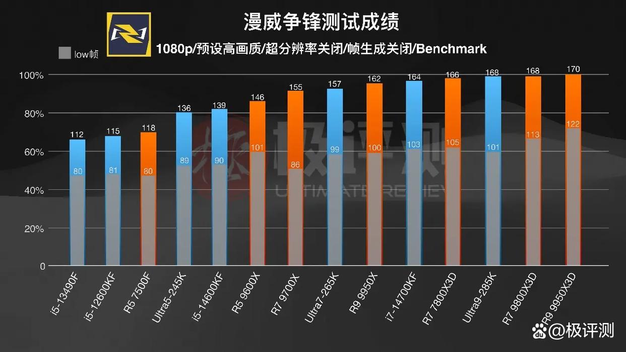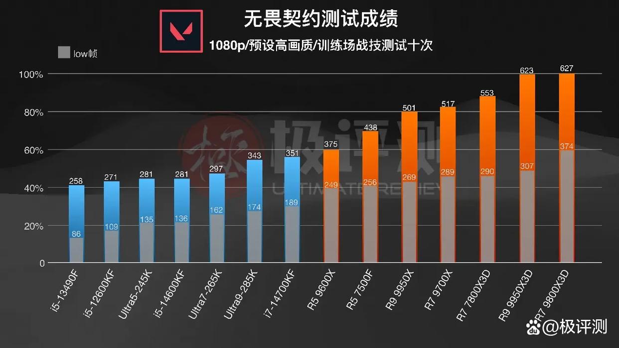 在《无畏契约》中,AMD与Intel的差距还在进一步扩大,直接成了泾渭分明的两部分,AMD七颗CPU全面领先,甚至7500F都有着夸张的领先,其实本来Intel的表现没有这么弱,但由于在游玩过程中频繁的掉帧,拉低了平均帧的成绩。