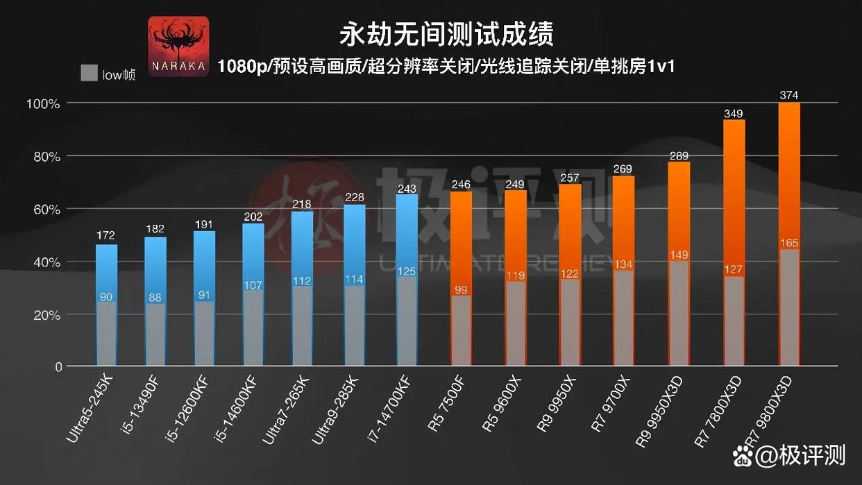 《永劫无间》中AMD的全面领先仍在继续,永劫无间对大缓存比较依赖,可以看到X3D系列处理器表现非常夸张,但由于是默认设置,9950X3D存在两个CCD,所以会出现调度问题帧数比起9800X3D有些偏低,其余X3D处理器也能看出LOW帧表现其实并不理想。