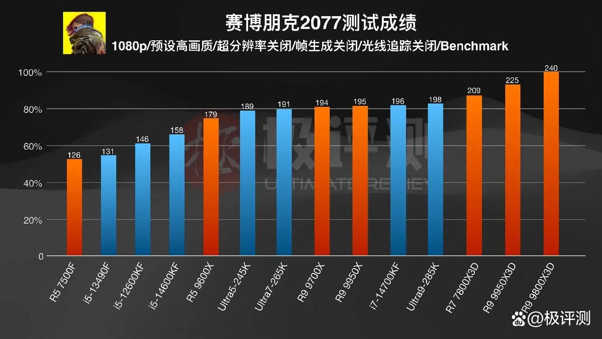 没想到在单机游戏里X3D系列处理器的领先还在延续,尤其是9800X3D,远高于其他CPU。其余成绩倒是大差不差,14700KF表现还不错,仅落后285K 2帧,但价格可是便宜了2000块钱。而中低端CPU中,帧数表现比较好的就是9600X了,相较14600KF提升了13%,比自家的7500F高了42%。在2077这样存在大量可交互物体的开放世界游戏中,对CPU的性能还是有一定要求的,9600X算是在价格与性能中取得了一个还算不错的平衡。