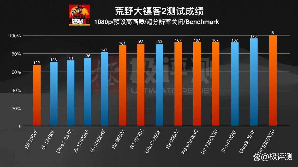 然后是经典开放世界游戏《荒野大镖客2》,这款游戏发布已经有七年时间了,不过它对新发布的CPU支持还不错,大家的表现都比较接近,基本上都拉不开太大差异,几颗低端CPU虽然稍弱一些差距但也不多。唯一让人比较失望的就是245K了,游戏性能确实十分一般。