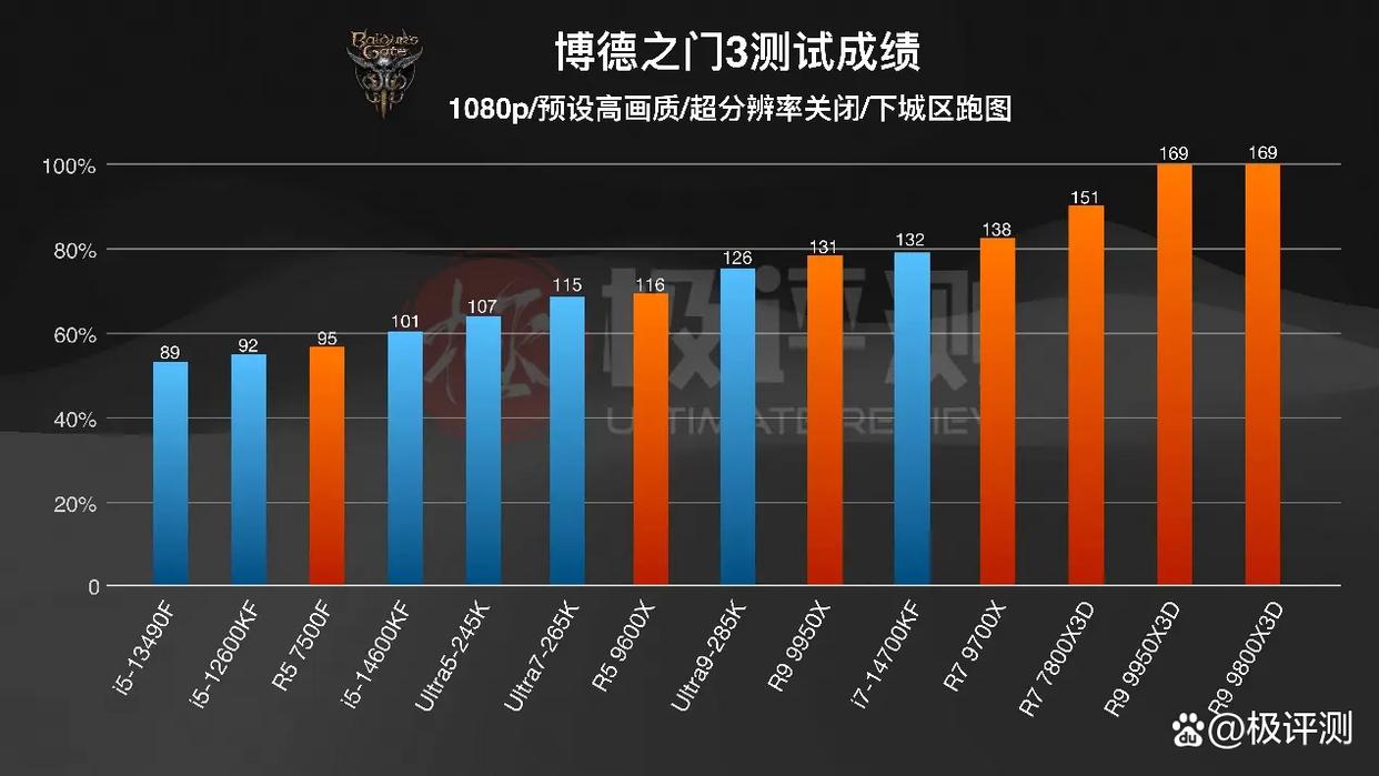可以看到,三颗有着大缓存的X3D处理器优势还是十分明显,与其他处理器拉开了不小的差距。《博德之门3》对于CPU的缓存十分敏感,尤其是在人物比较多的下城区中。Intel中表现比较好的依旧是14700KF,比285K还要高一些。而像12600KF和13490F等中低端CPU表现就有些不尽如人意了,最大的问题就是在遇到一些复杂场景的时候会出现比较严重的帧率波动。