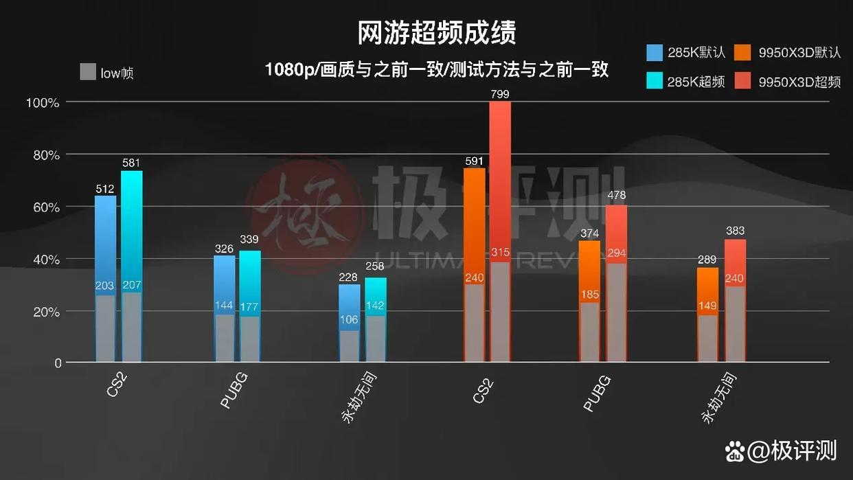 可以看到两颗CPU在超频后,对比之前的默认成绩,帧率都有了一定程度的上涨,Low帧也有了很不错的提升,进一步降低了卡顿和掉帧的风险。虽然285K对比之前也有了不小的提升,但是目光放到9950X3D的成绩,不得不感叹真的是强出天际。9950X3D帧数上获得的提升是远远大于285K,超频是彻底释放了这颗处理器的潜力。Low帧跟之前相比完全强了不止一个层次,在平均帧的提升上基本都在30%左右,而在永劫无间Low帧提升甚至达到了61%,都快赶上285K的平均帧了。