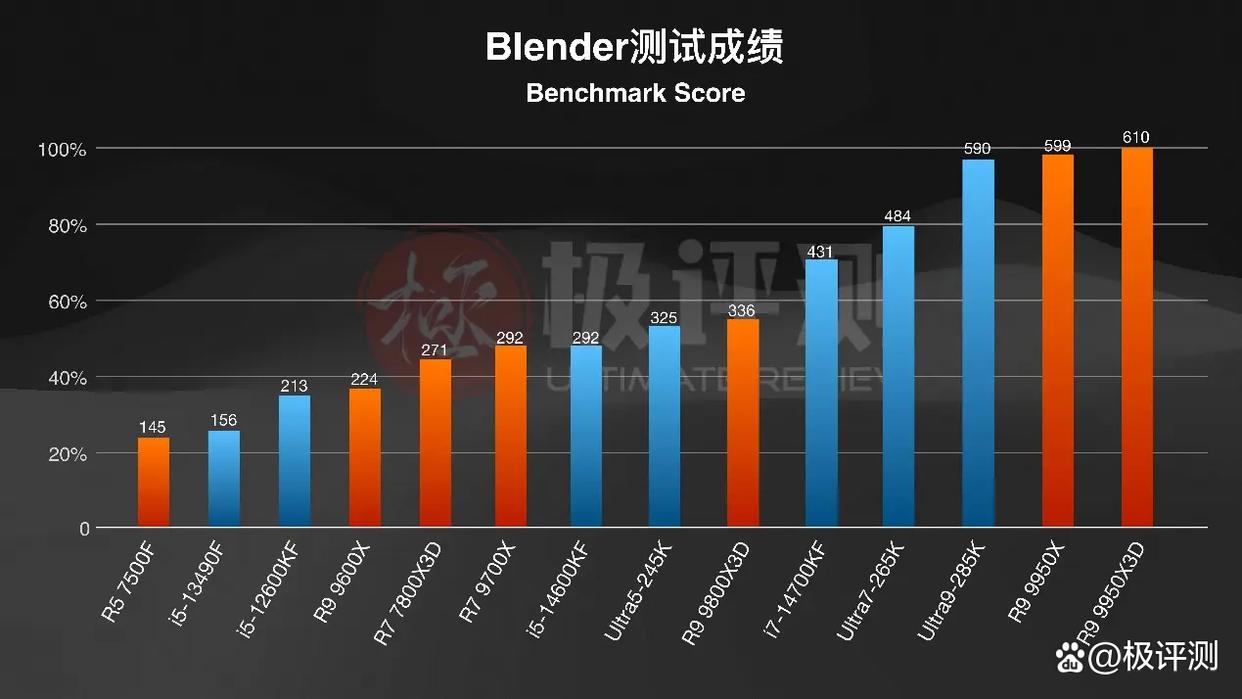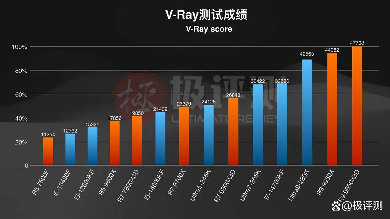 最后就是一些常见的生产力场景了,相比与之前基准跑分,在Blender和V-Ray两项中测试中,两款锐龙9处理器的性能都有所回升,领先于285K。但在中低端领域,AMD的其余CPU也算是遇上了滑铁卢,很难再出现游戏场景中默秒Intel全家的情况了,9700X、7800X3D、9600X都没能比过14600KF。