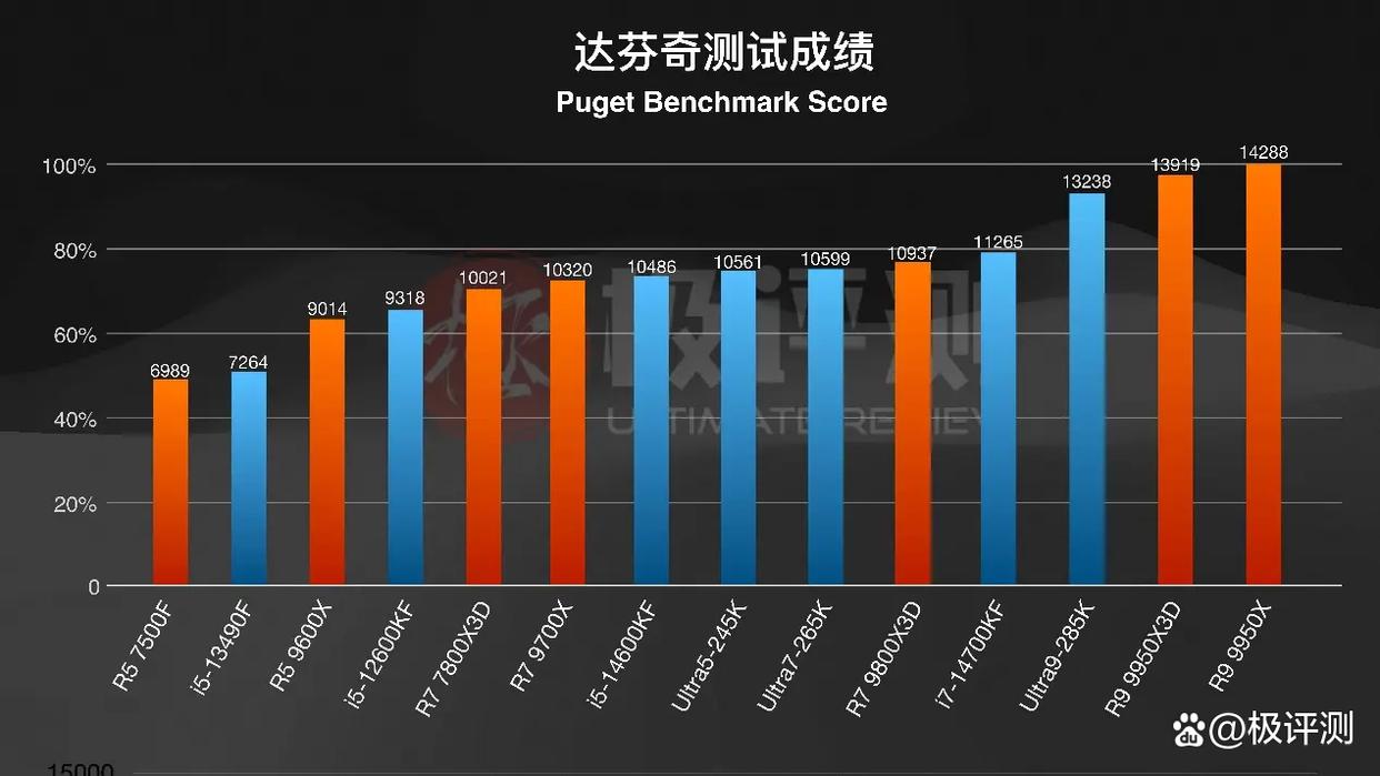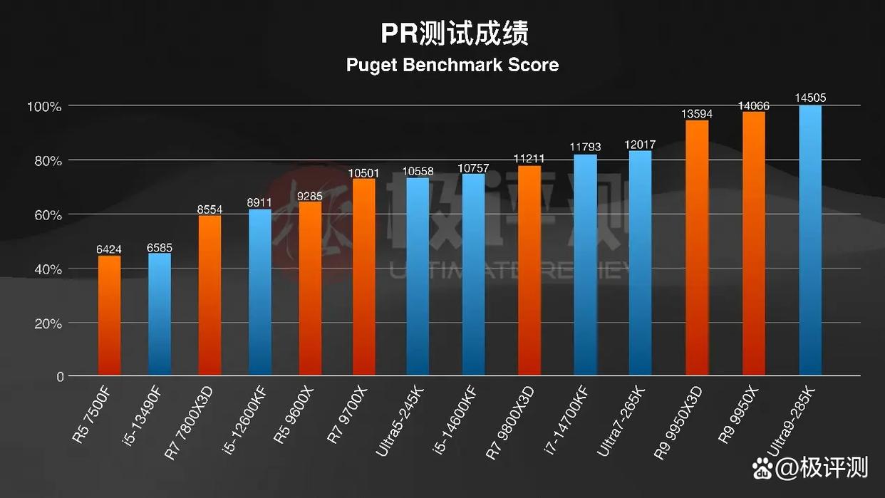在视频编辑软件PR中,285K拔得头筹,9950X紧随其后,差距并不算大,285K有着24核心24线程,多核心数和线程数能显著提升H.264/H.265的导出速度,在PR这种视频编辑软件中优势很大。因此可以看到9600X这类6核12线程的游戏U跑分数据就很一般了。