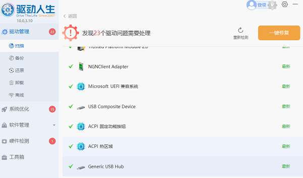 通过专业的驱动管理软件“驱动人生”可以自动扫描响应的硬件,然后匹配合适的驱动进行下载安装。步骤示例如下: