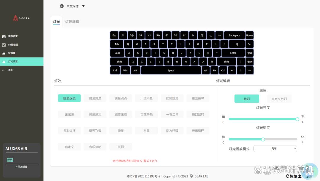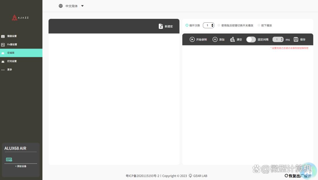 值得一提的是,黑爵ALUX68 AIR三模机械键盘还支持定制驱动与网页驱动,从而可以对其按键功能、Fn层功能、宏以及背光等功能进行自定义。黑爵ALUX68 AIR三模机械键盘的界面比较简单,宏功能界面只需要玩家消除按键延迟,之后按下所需要触发的功能即可,保存之后便可以在按键功能设置界面找到。而在背光界面,除了预设的诸多背光效果之外,黑爵ALUX68 AIR三模机械键盘能够自定义每个按键的背光功能,从而打造更个性的键盘风格。