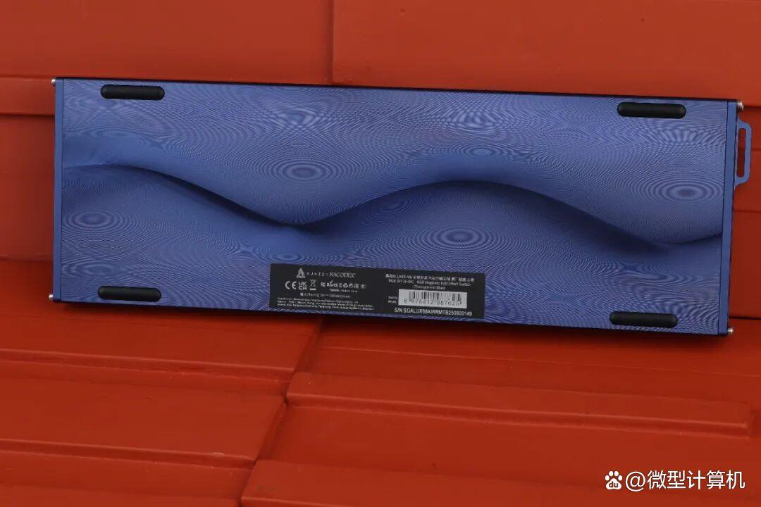 ▲键盘底部去掉了支脚设计,仅剩下脚贴以及铭牌。同时,底部还采用独特的水波刀纹设计,能够提供相当出色的视觉效果。