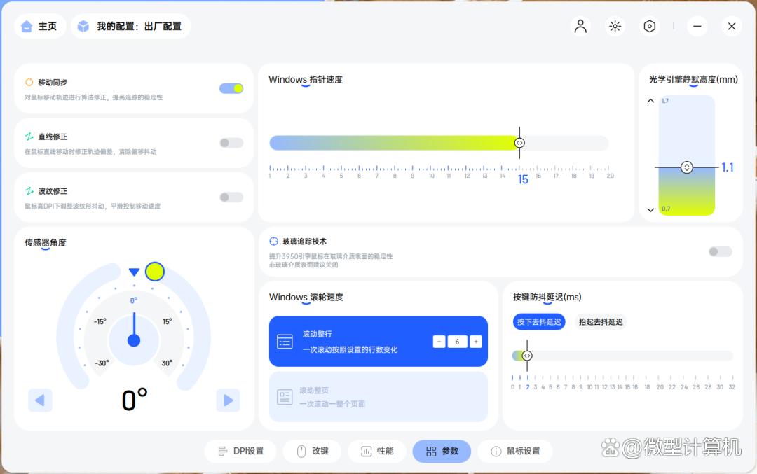 参数调节界面则尽显细致周全,涵盖指针速度、传感器角度、滚轮速度、去抖延迟以及静默高度等核心选项,同时支持移动同步、直线修正等功能的启闭,较前几代产品选项更为丰富,可实现“千人千面”的精细化适配。