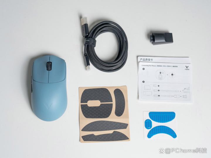 值得一提的是,雷柏VT7系列的配套配件也同步迎来升级。附赠的新一代Nano微型8K接收器,体积较上一代进一步缩减,同时保留了电量指示灯设计,设备续航状态一目了然。随附的数据线则升级为8K规格带屏蔽层款式,大幅提升传输稳定性。此外,套装还包含脚贴、防滑贴及新款转换器等实用配件,为玩家提供丰富的DIY调整空间与多场景适配可能,进一步完善了整体使用体验。