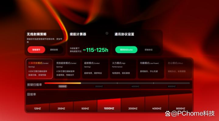 性能模式有五种可以选:狂暴竞技模式、竞技超核模式、超核模式、火力模式、办公模式。打游戏选狂暴竞技模式,传感器扫描频率直接拉满,延迟超低,办公就选办公模式,续航更久,能在性能和续航之间自由切换。最方便的是它能预设不同场景的配置,打开游戏自动切高性能模式,日常用自动切省电模式,不用手动调,特别省心。目前A HUB已同时兼容Windows、macOS双系统及网页驱动三平台,再加上配置文件跟随应用切换功能,在国产厂商中可以说是独一份的存在。