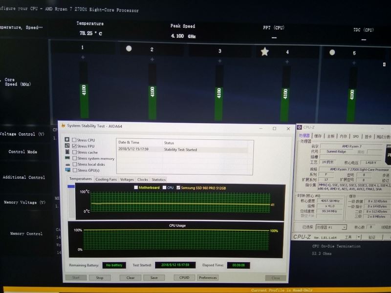 我们选用了内部钎焊导热的AMD Ryzen 7 2700X作为测试用的CPU,并超频至4.1GHz,电压为1.41V。导热硅脂为Arctic MX-4。