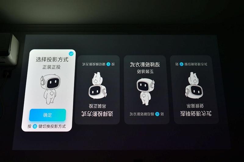 初次启动时当贝S7 Ultra Pro投影仪会提示选择正确的投影方式,当贝S7 Ultra Pro投影仪支持正装吊装、正投背投共计四种安装方式,我们现在直接使用默认的正装正投就好。