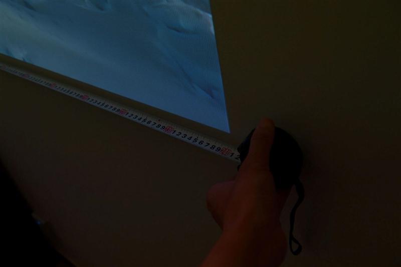 此时我们可以直接测量出投影画面宽度约240cm,投影仪距离墙面约250cm(垂直距离),投射画面尺寸约108寸,实际观看时巨大的画面极为壮观。