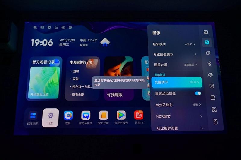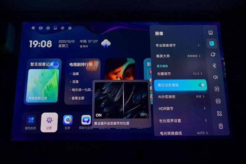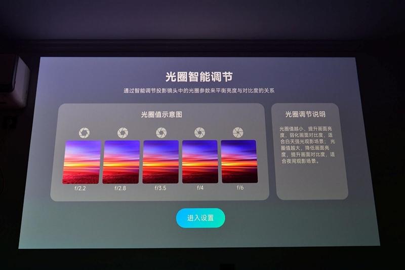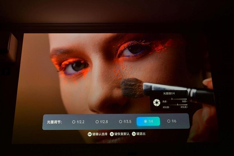 每次设置新的光圈时,都可以听见当贝S7 Ultra Pro投影仪内部的机械结构运作的声音,从画面上也可以很直观的看到亮度和对比度的变化。不过得益于当贝S7 Ultra Pro投影仪三色激光高达5300 CVIA亮度,即使时收到最小光圈F6,画面亮度也依旧完全足够。