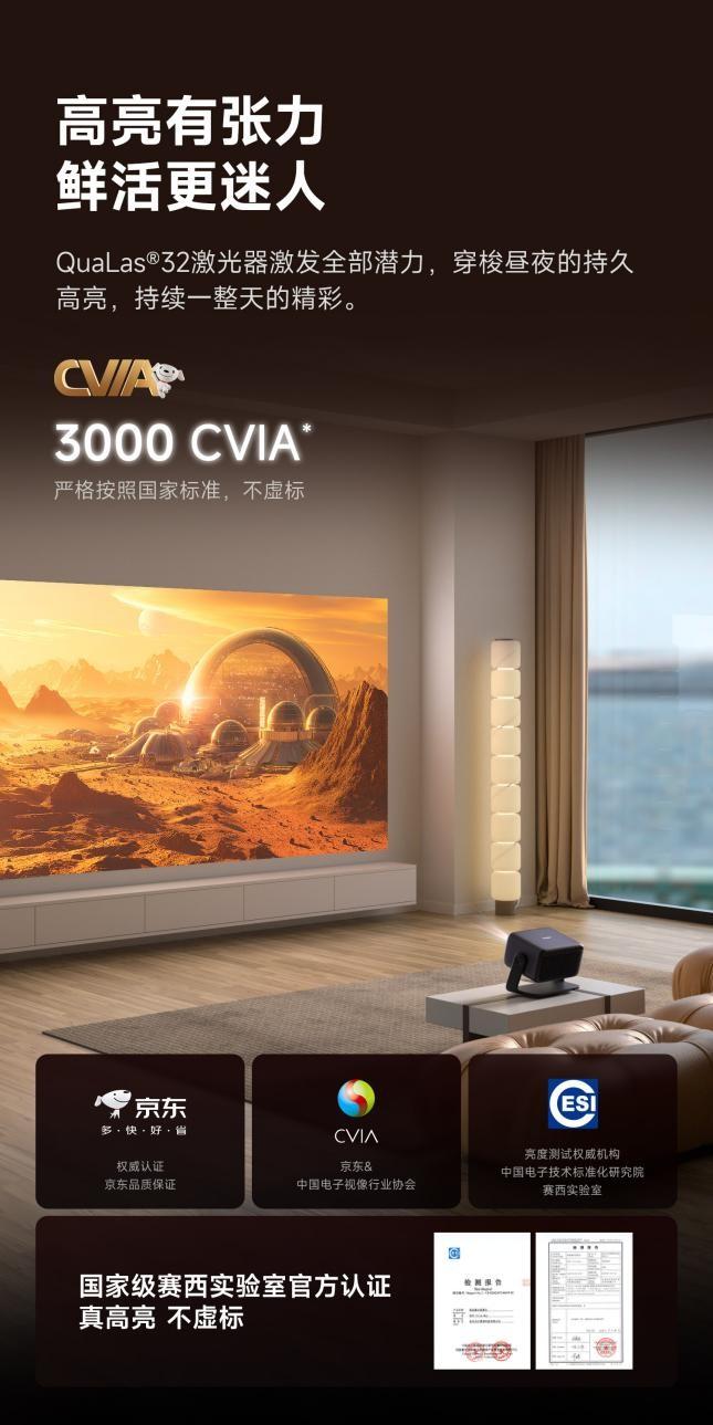 在亮度方面,当贝X5S Max使用ALPD激光,亮度达到2800 CVIA流明,当贝X7 Ma采用2组QuaLas 32激光器,并且采用了独特的光路黑化设计,进一步将亮度提升到了3000 CVIA流明。更强的亮度和抗光性,让投影仪在客厅开灯观影或者白天观影的场景下也能投出清晰明亮的画面。
