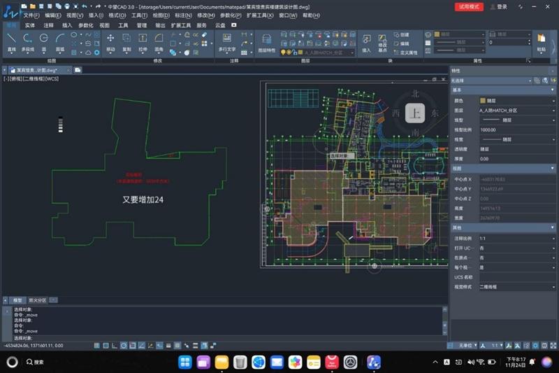 鸿蒙二合一平板电脑预装的中望CAD个人版,完全复刻了 Windows PC 版的全量功能,不仅采用一致的大屏布局,工具栏、菜单栏、功能区也一应俱全。像图纸浏览、绘制、编辑、标注、打印等高频功能,以及文件对比、智能夹点、批量打印等专业功能均全部保留。