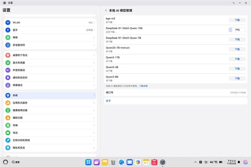 鸿蒙二合一平板电脑在系统设置中内置了统一的AI模型管理中心,通过清晰直观的图形界面,一键完成对各类AI模型的下载、更新与卸载,而无需复杂的代码和复杂的后台配置。