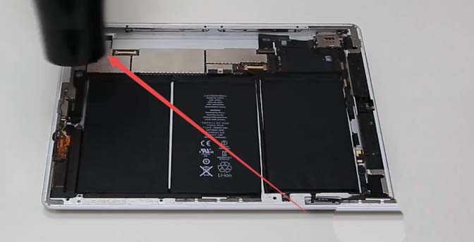 8、接下来就是拆电池了,我们依然用吹风机对着电池加热个2分钟,让电池的胶更加松软,这样更容易取下电池