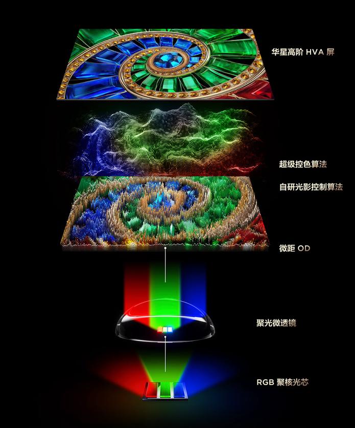 RGB-Mini LED 的基本原理和 Mini LED 一致,但直接采用由 RGB(红、绿、蓝)三色独立驱动的 LED 背光灯珠,在背光阶段就让光源具备完整的色彩信息,从而实现画面的「光色同控」。