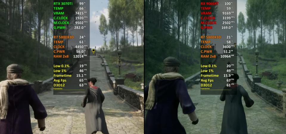 在平均帧速方面,Radeon RX 9060 XT平台比GeForce RTX 3070 Ti平台高2 FPS,最低瞬时帧速低4 FPS,帧时间相等,差距非常微弱,总体仍是平局。
