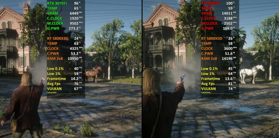 对比结果很明显,整体而言,Radeon RX 9060 XT和GeForce RTX 3070 Ti的性能比较接近,基本持平,Radeon RX 9060 XT略占一点上风。