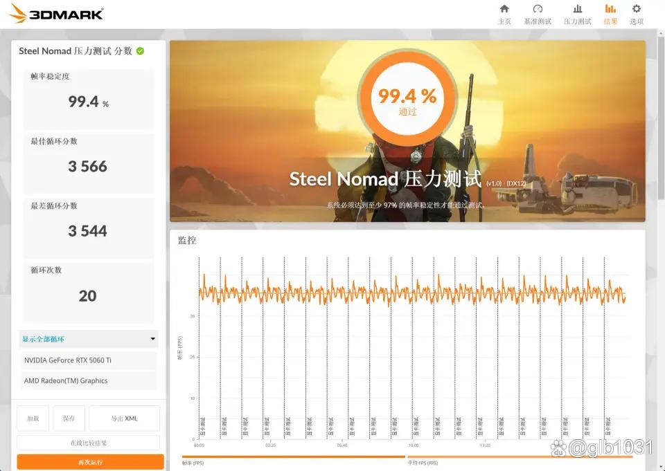 3DMark的Steel Nomad压力测试自然也是毫无问题,最佳循环分数3566,最差循环分数3544。