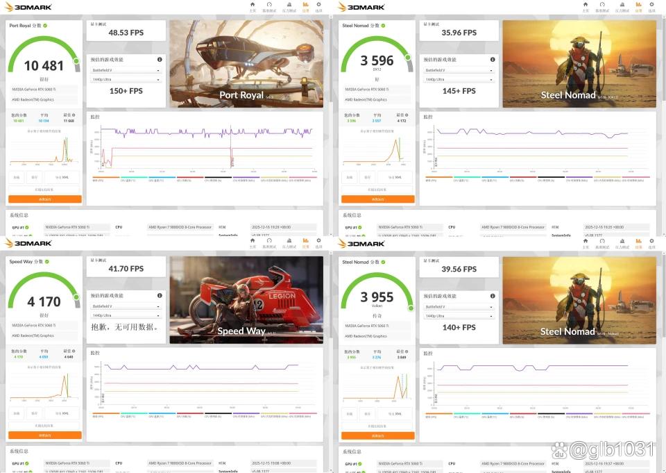 3D Mark基础性能测试方面,iGame RTX 5060 Ti Mini OC 显卡的测试成绩我也对比了我首发测试的三风扇版本的RTX 5060 Ti的成绩,整体分数几乎没有差异。上下浮动不十几分而已。