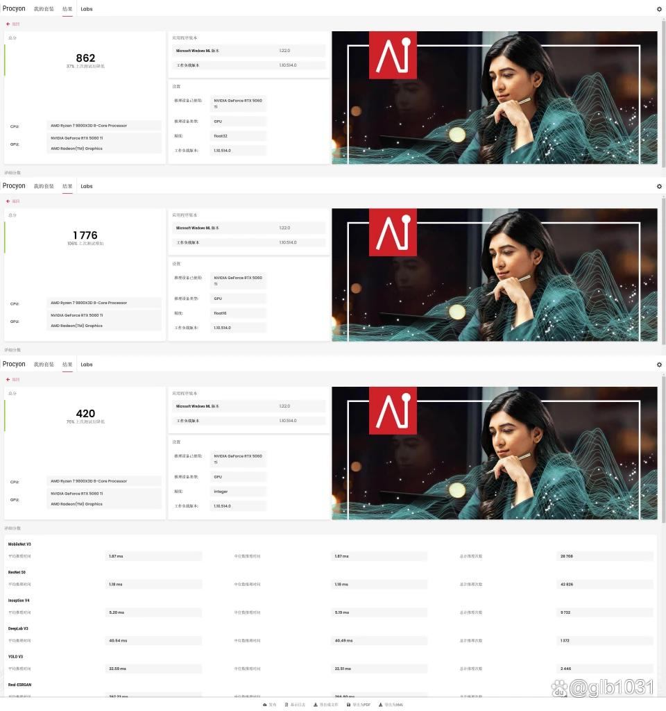Procyon的NVIDIA TensorRT AI性能测试如图。