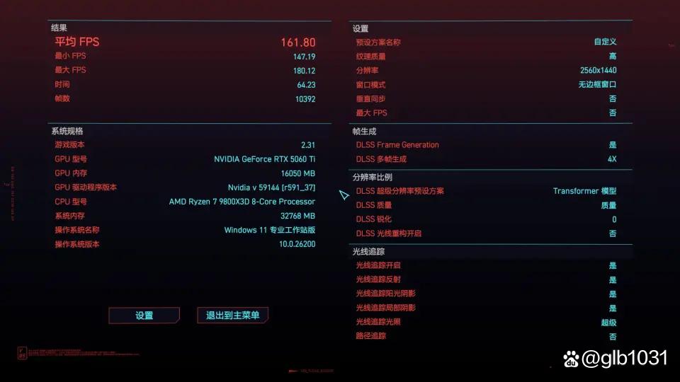「赛博朋克2077」游戏2K 分辨率下开启光追的情况下,开启DLSS 4游戏平均帧数达到了161.8 FPS,最低帧数147.19 FPS。