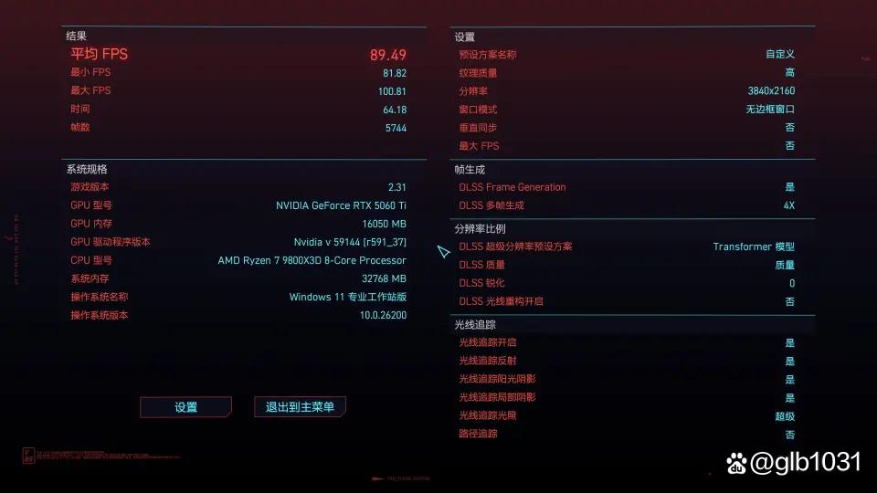 「赛博朋克2077」游戏4K 分辨率下开启光追的情况下,开启DLSS 4游戏平均帧数达到了89.49 FPS,最低帧数81.82 FPS。