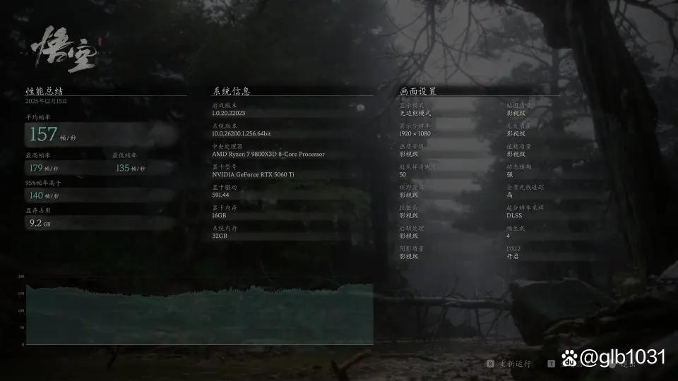 「黑神话:悟空」游戏在1080P分辨率下,开启全景光线追踪超级后超级采样率为50(性能)的情况下,开启DLSS 4后游戏平均帧数157 FPS,最低帧数135 FPS。