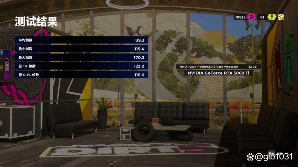 「尘埃5」游戏1080P分辨率,预设超高画质下,同时开启光线追踪车辆阴影游戏平均帧数139.3 FPS,最低帧115.4 FPS。