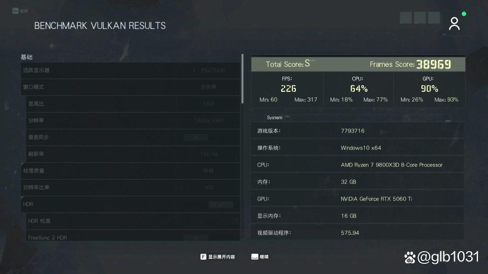 「幽灵行动:断点」1080P分辨率最高画质下游戏平均帧数226 FPS,最小帧60 FPS,得分38969分;