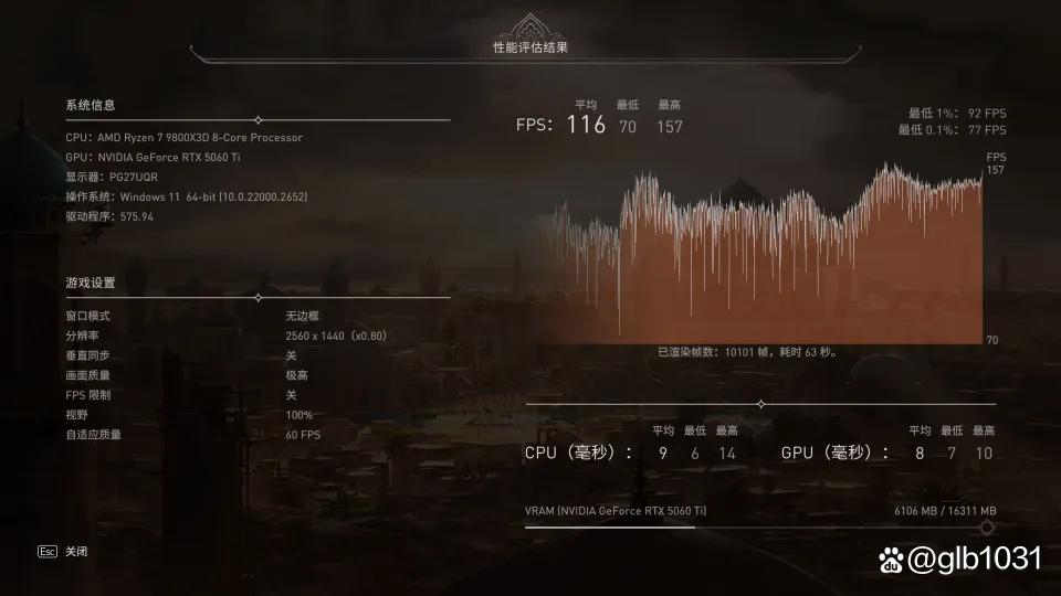 「刺客信条:幻影」游戏在2K分辨率下极高画质,开启FSR,游戏平均帧:116 FPS,最低帧:70 FPS。