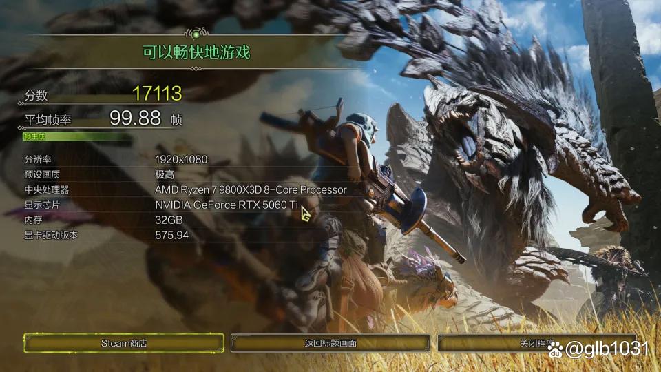 「怪物猎人:荒野」游戏1080P分辨率,预设画质极高,游戏平均帧数99.88 FPS,分数17113。