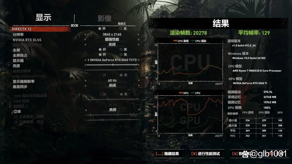 「古墓丽影:暗影」游戏在4K分辨率下影视级画质,开启光追的情况,开启DLSS ,游戏平均帧:129 FPS。