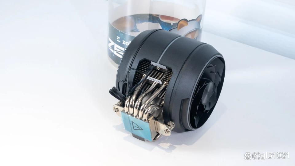 圆形的散热主体在风冷产品中真的是非常少见的造型了,两侧设计了两把磁吸风扇设计。正反叶设计,5片扇叶设计也犹如飞机发动机造型。