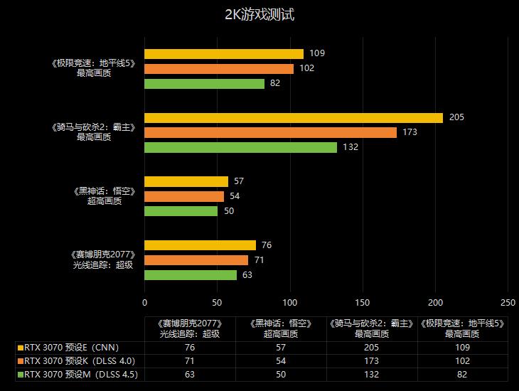 总的来说,这代DLSS 4.5的提升是比较大的,在画质层面带来较为显著的改善。但是对20系和30系这种老卡来说,DLSS 4.5的正向收益就不那么明显了,由于模型计算量大幅增加,20系和30系显卡的Tensor Core不支持FP8运算,所以会存在不小的性能开销,2K分辨率下的游戏平均帧率比传统CNN模型低了24%,对不支持帧生成的RTX老卡影响非常大,相比之下DLSS 4.0对帧率的影响小一些,画质也比CNN模型好得多,可能更适合20系和30系显卡。